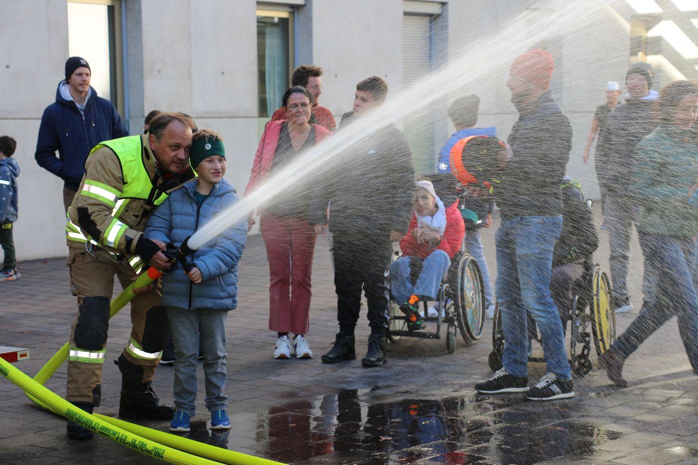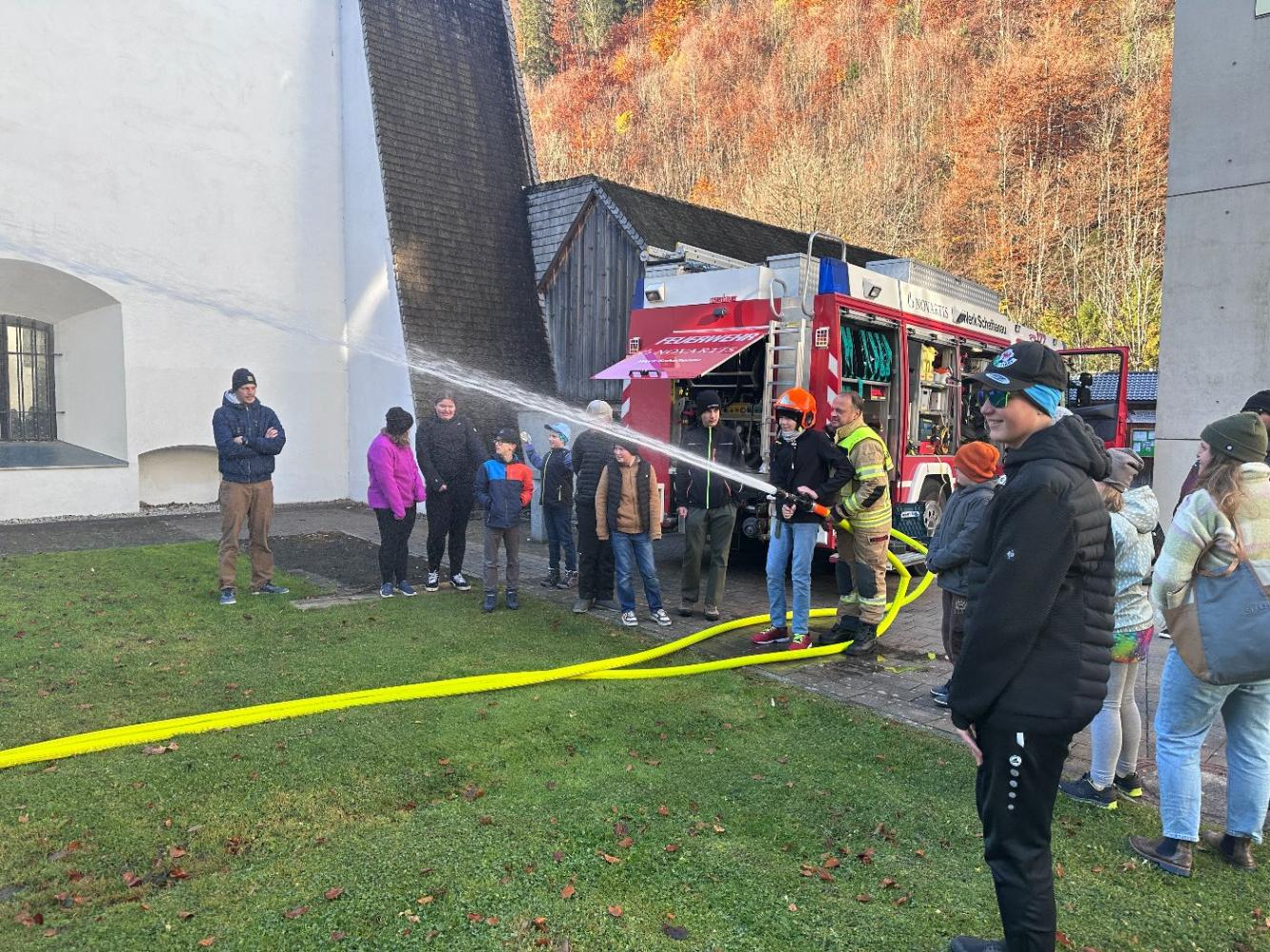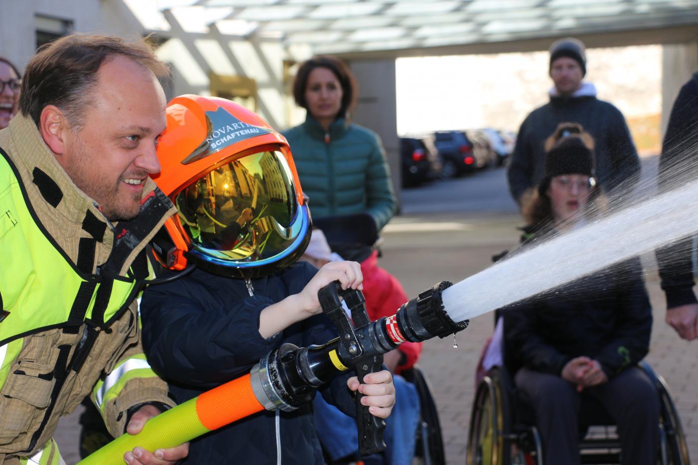 Am Vormittag besuchte uns die Betriebsfeuerwehr von Novartis Schaftenau. Die Kinder und Jugendlichen durften das Einsatzfahrzeug erkunden und die Ausrüstung kennenlernen. Besonders viel Freude bereitete das Ausprobieren der Wasseranlage, und das absolute Highlight war die Mitfahrt im Feuerwehrauto.